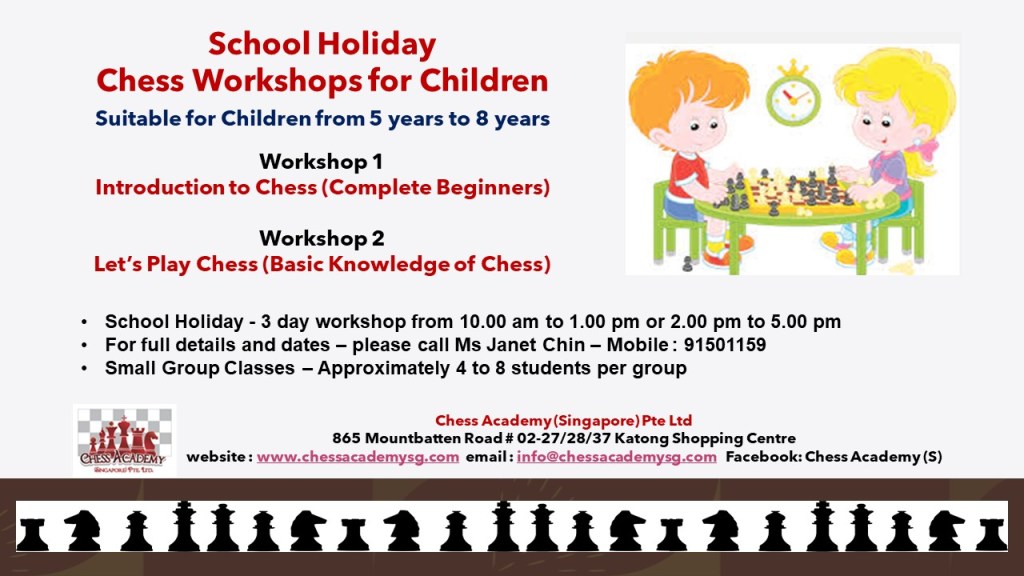 October 22, 2020October 22, 2020chessacademysg image School Holiday Chess Workshops for Young Children Share this: Click to share on X (Opens in new window) X Click to share on Facebook (Opens in new window) Facebook Like Loading... Related