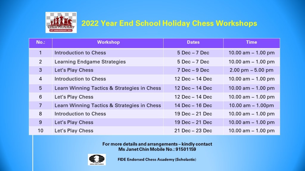 December 3, 2022December 3, 2022chessacademysg image 2022 Year End (December) Chess Workshops Share this: Click to share on X (Opens in new window) X Click to share on Facebook (Opens in new window) Facebook Like Loading... Related