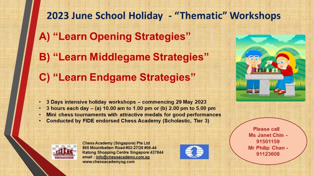 May 19, 2023May 19, 2023chessacademysg image 2023 June School Holiday Workshops Share this: Click to share on X (Opens in new window) X Click to share on Facebook (Opens in new window) Facebook Like Loading... Related
