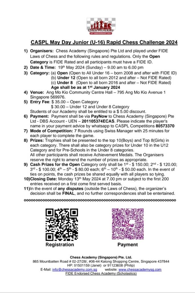 April 26, 2024April 26, 2024chessacademysg image CASPL May Day Junior (Under 16) Chess Challenge 2024 – Registration. Share this: Click to share on X (Opens in new window) X Click to share on Facebook (Opens in new window) Facebook Like Loading... Related