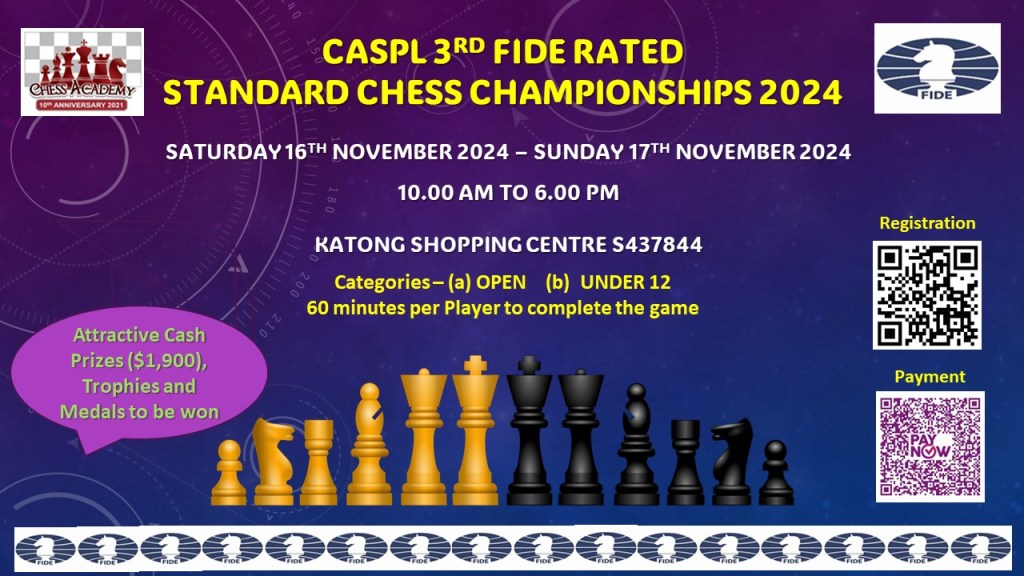 September 12, 2024September 12, 2024chessacademysg image CASPL 3rd FIDE Rated Standard Chess Championships 2024 Share this: Click to share on X (Opens in new window) X Click to share on Facebook (Opens in new window) Facebook Like Loading... Related