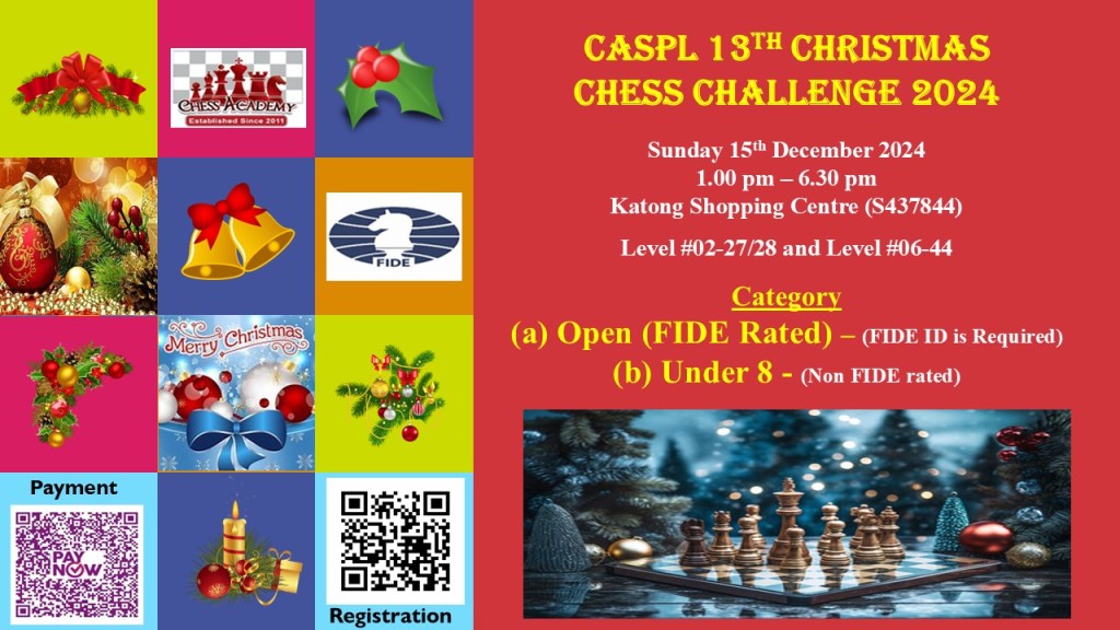October 17, 2024October 17, 2024chessacademysg image CASPL 13th Christmas Chess Challenge 2024 Share this: Click to share on X (Opens in new window) X Click to share on Facebook (Opens in new window) Facebook Like Loading... Related