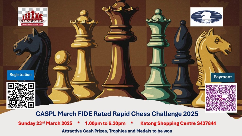 January 20, 2025January 20, 2025chessacademysg image CASPL March Open FIDE Rated Rapid Chess Challenge 2025 Share this: Click to share on X (Opens in new window) X Click to share on Facebook (Opens in new window) Facebook Like Loading... Related
