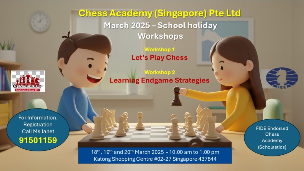March 12, 2025March 12, 2025chessacademysg image March 2025 School Holidays Chess Workshops Share this: Click to share on X (Opens in new window) X Click to share on Facebook (Opens in new window) Facebook Like Loading... Related