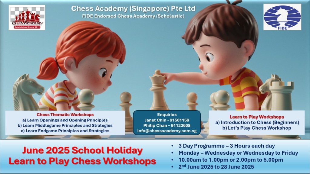 May 31, 2025May 31, 2025chessacademysg image June 2025 School Holiday Workshops Share this: Click to share on X (Opens in new window) X Click to share on Facebook (Opens in new window) Facebook Like Loading... Related