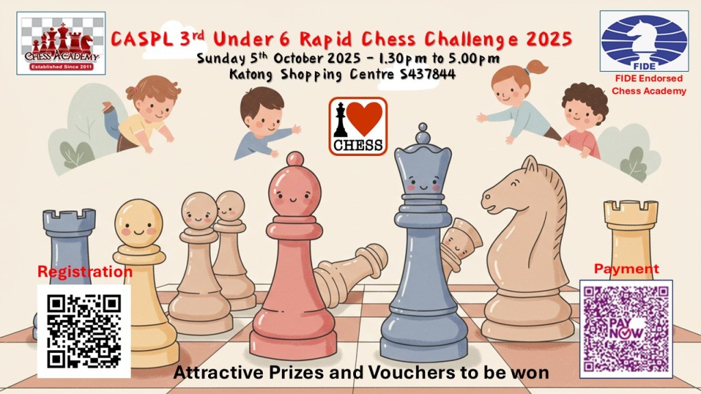 September 19, 2025September 19, 2025chessacademysg image CASPL 3rd Under 6 Rapid Chess Challenge 2025 Share this: Click to share on X (Opens in new window) X Click to share on Facebook (Opens in new window) Facebook Like Loading... Related