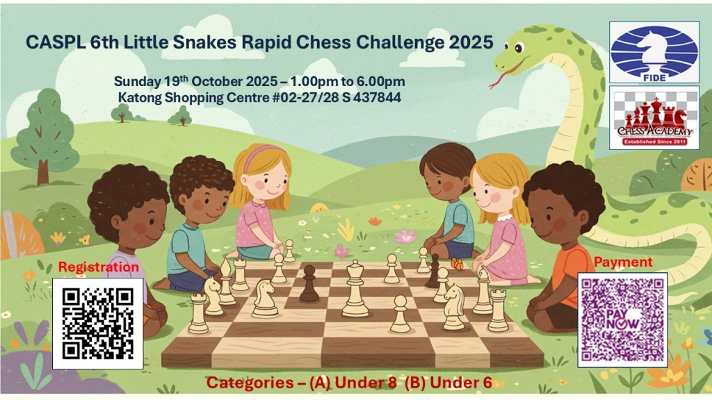 September 19, 2025September 19, 2025chessacademysg image CASPL 6th Little Snakes Rapid Chess Challenge 2025 Share this: Click to share on X (Opens in new window) X Click to share on Facebook (Opens in new window) Facebook Like Loading... Related