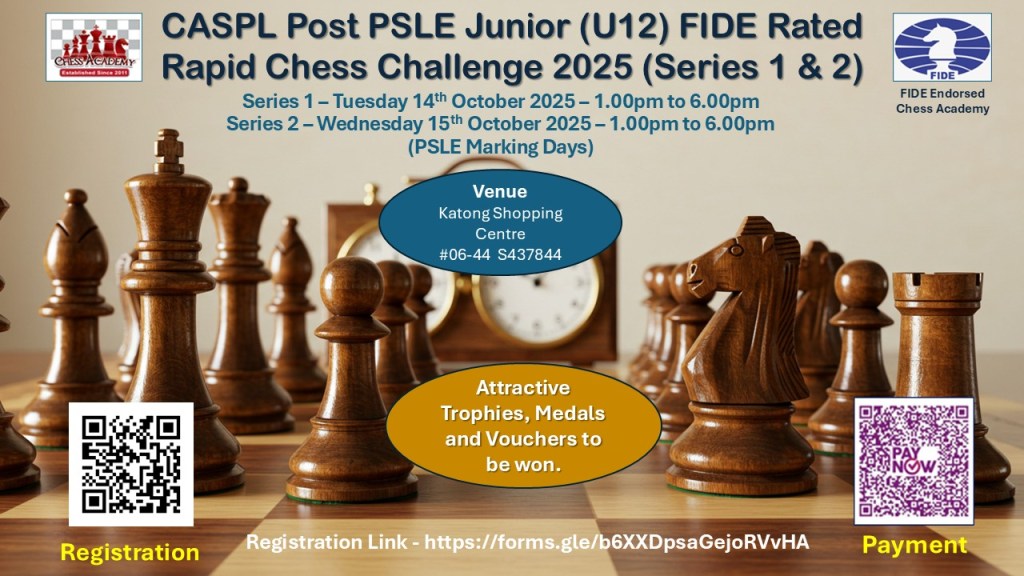 September 19, 2025September 19, 2025chessacademysg image CASPL Post PSLE Junior (U12) FIDE Rated Rapid Chess Challenge 2025 (Series 1 & 2) Share this: Click to share on X (Opens in new window) X Click to share on Facebook (Opens in new window) Facebook Like Loading... Related
