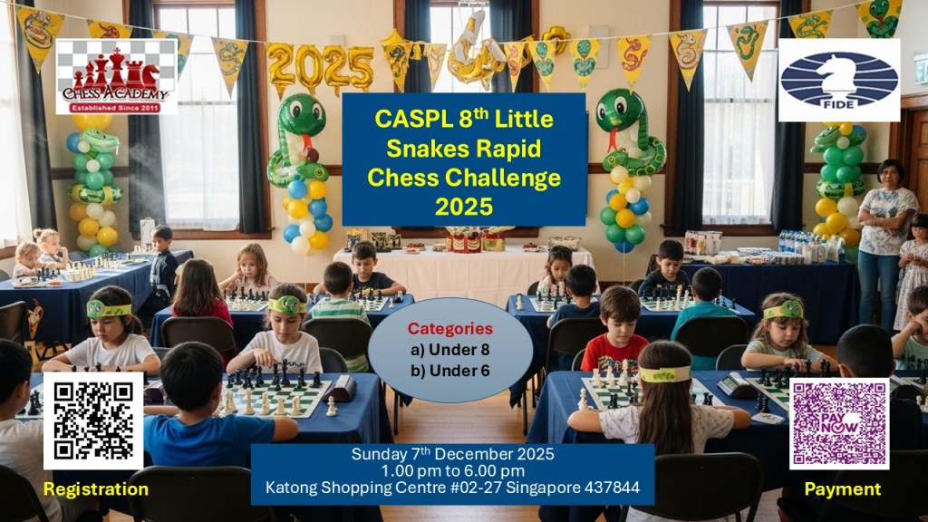 November 24, 2025November 24, 2025chessacademysg image CASPL 8th Little Snakes Rapid Chess Challenge 2025 – Under 8 and Under 6 categories Share this: Click to share on X (Opens in new window) X Click to share on Facebook (Opens in new window) Facebook Like Loading... Related