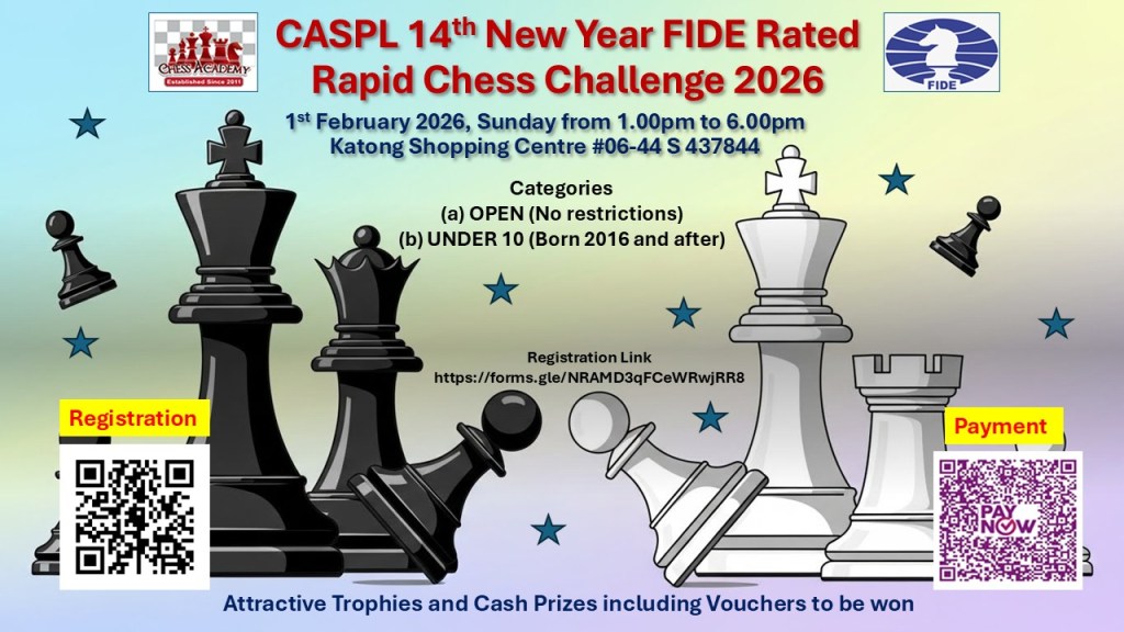 8 hours ago January 12, 2026January 12, 2026chessacademysg image CASPL 14th New Year FIDE Rated Rapid Chess Challenge 2026 – Sunday,1st February 2026 Share this: Click to share on X (Opens in new window) X Click to share on Facebook (Opens in new window) Facebook Like Loading... Related