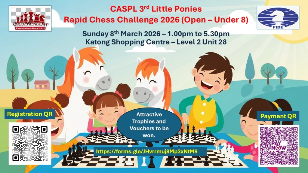 16 hours ago February 12, 2026February 12, 2026chessacademysg image CASPL 3rd Little Ponies Rapid Chess Challenge 2026 – 8th March 2026 Share this: Share on X (Opens in new window) X Share on Facebook (Opens in new window) Facebook Like Loading... Related