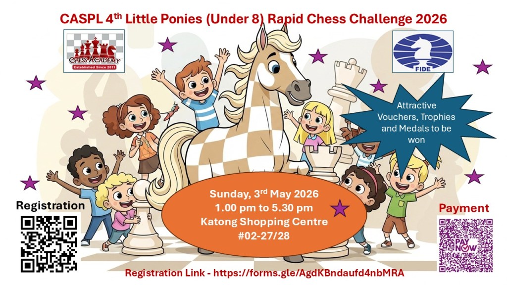 2 hours ago April 8, 2026April 8, 2026chessacademysg image CASPL 4th Little Ponies (Under 8) Rapid Chess Challenge 2026 – Sunday 3rd May 2026 Share this: Share on X (Opens in new window) X Share on Facebook (Opens in new window) Facebook Like Loading... Related