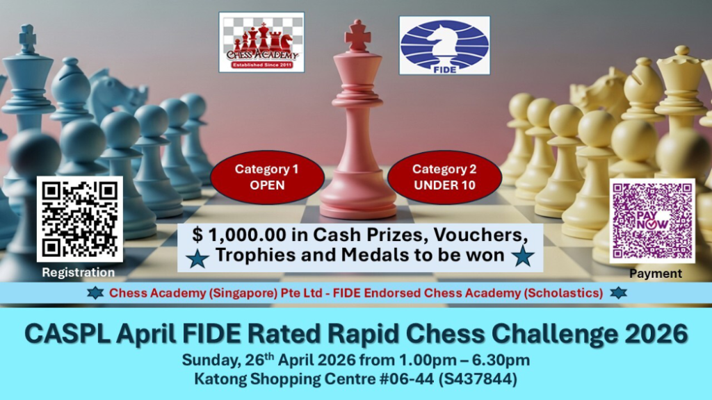 3 hours ago April 8, 2026April 8, 2026chessacademysg image CASPL April FIDE Rated Rapid Chess Challenge 2026 – Sunday 26th April 2026 Share this: Share on X (Opens in new window) X Share on Facebook (Opens in new window) Facebook Like Loading... Related