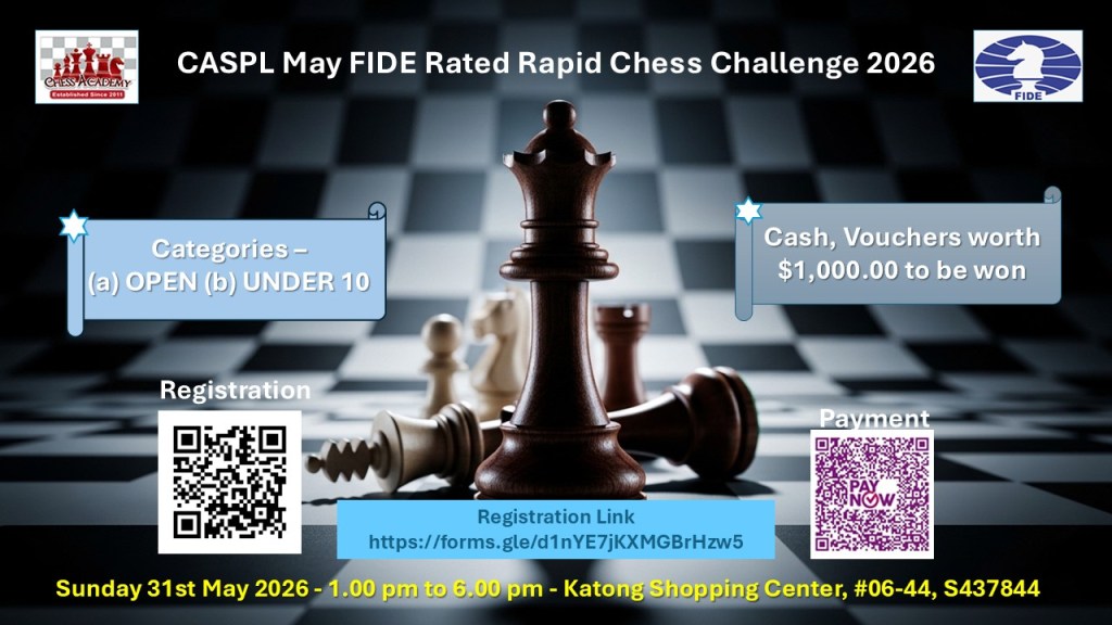 5 hours ago April 24, 2026April 24, 2026chessacademysg image CASPL May FIDE Rated Rapid Chess Challenge 2026 Share this: Share on X (Opens in new window) X Share on Facebook (Opens in new window) Facebook Like Loading... Related